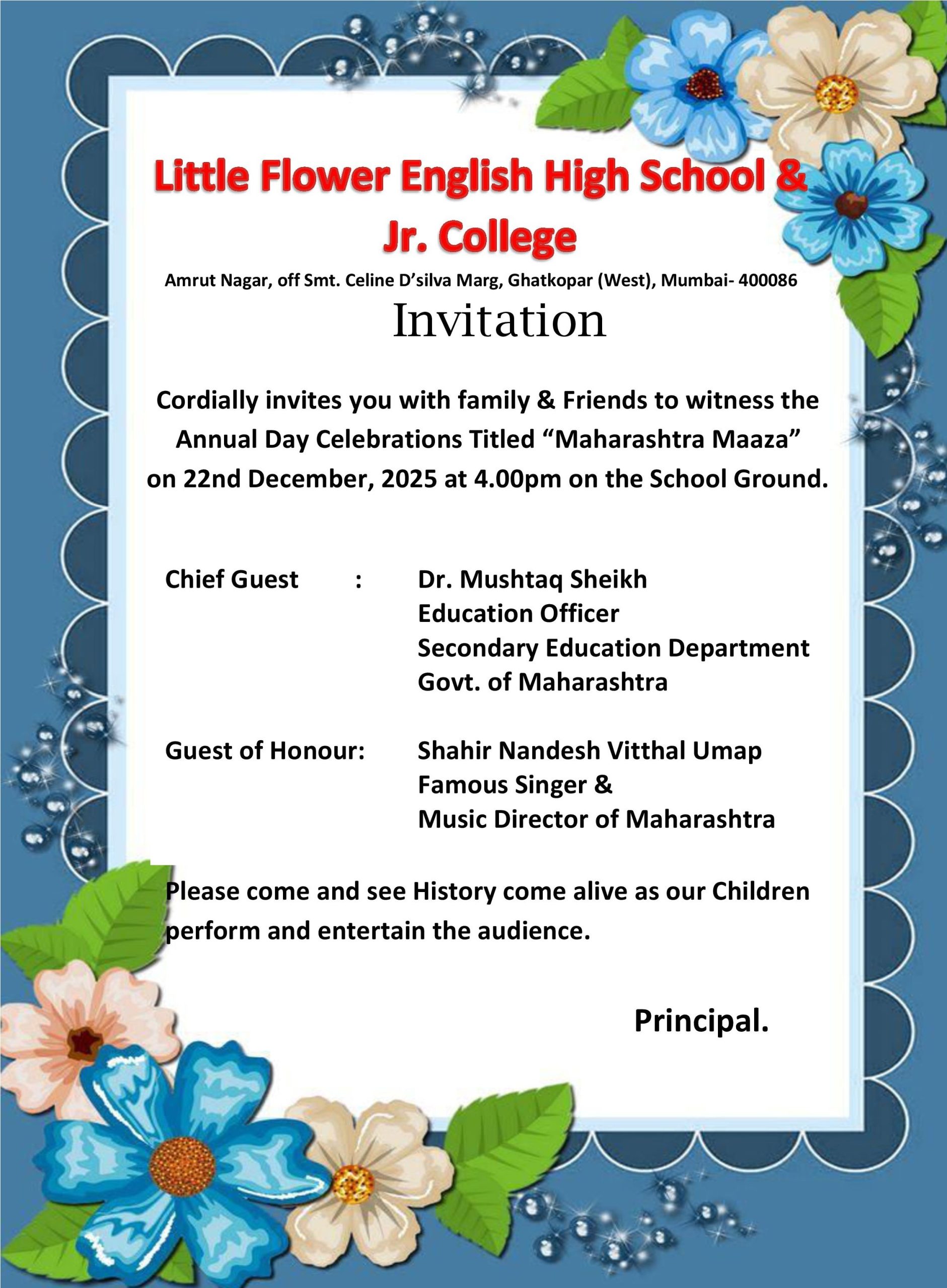 Little Flower English High school and Jr college is a co education institution affiliated to Maharashtra State Board of Secondary and Higher Secondary Education MSBSHSE.It is managed by Little Flower Education Society.